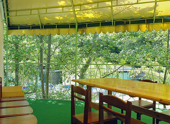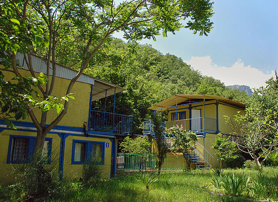 — в отдельных летних домиках, расположенных над речкой: 2 — 3-х местное размещение, в комнате умывальник и туалет, душ общий в корпусе;